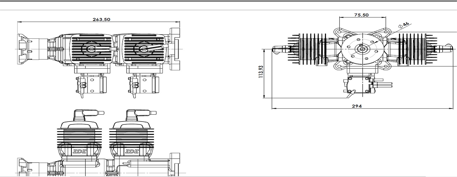 Displacement: 195ccm Weight: 3490g/4840g with el. starter) Bore: 52mm Stroke: 46mm RPM range 1000-8500ot/min Ignition : Processor controlled 4,8-7V Fuel mixture N95+rec. oil: 1:35 Recomm. twinblade props: 32x12, 33x12 Recomm threeblade props: 30x13