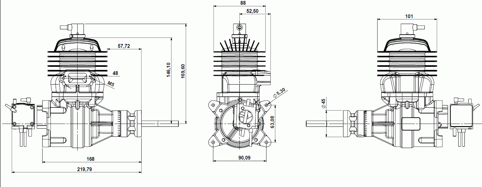 Displacement: 97 ccm Weight: 2190g (3380g with electric starter) Bore: 52 mm Stroke: 46 mm RPM range: 1000-8500RPM Ignition unit: Processor controlled 4,8-7V Fuel mixture(N95+oil): 1:40 Recommended twinblade propellers: 27x12, 28x10, 28x12 Recommended three blade propellers: 25x12, 26x12